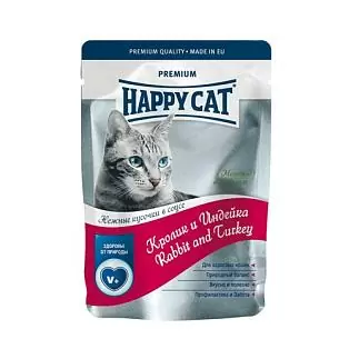 HAPPY CAT нежные кусочки с кроликом, индейкой и морковью.Happy Cat обеспечивает правильное, разнообразное питание кошки. Этот ассортимент уникальных, вкусных и натуральных кормов на основе специально отобранных рецептов, готовится на основе мяса и натуральных ломтиков, содержит все необходимые и полезные вещества. Удобная упаковка и способ приготовления позволяют сохранить все ценные диетические свойства натуральных продуктов, что определяет их лучшее качество, полезность и поедаемость, гарантируя здоровье и жизненные силы кошки. Ваша кошка будет довольна!