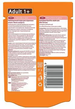Ингредиенты | Мясо и производные животного происхождения (>25% курица и птица, >3% свинина), рыба и производные рыбы (>4% лосось), масла и жиры, производные растительного происхождения (из которых 0,6 % пульпа сахарной свеклы), минералы, сахара |