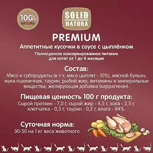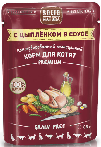 | Краткое описание | SOLID NATURA Premium с цыпленком. Полноценное консервированное питание для котят от 1 до 4 месяцев. Аппетитные кусочки в соусе. Пауч 85 гр. |