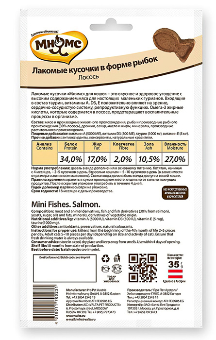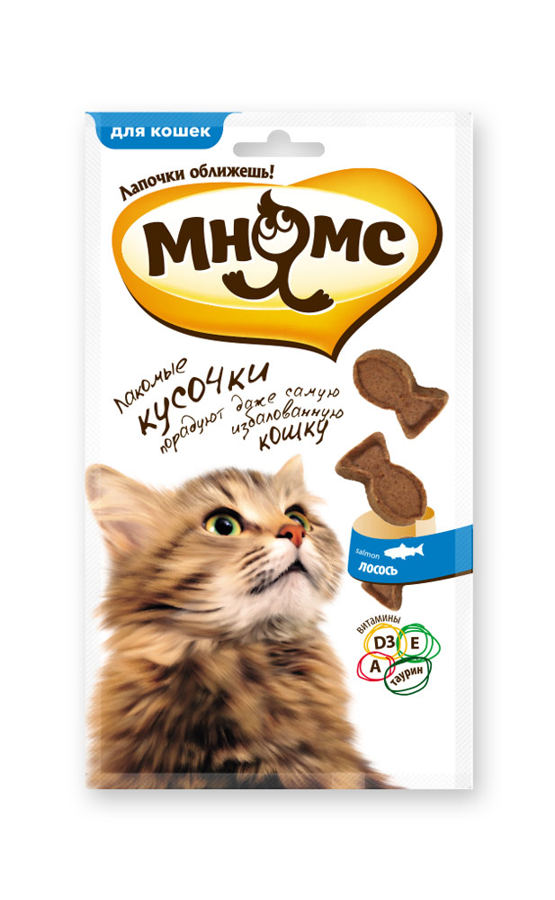 МНЯМС лакомые кусочки для кошек в форме рыбок, со вкусом лососяЛакомые кусочки «Мнямс» были разработаны специально для кошек-гурманов. Изысканный вкус лосося и мясного ассорти не оставит ни одну привереду равнодушной. Входящие в состав лакомств таурин, витамины A,D3, E положительно влияют на зрение, сердечно-сосудистую систему, репродуктивную функцию,а Омега-3 в лососе помогают снизить воспалительный процесс в организме питомца.