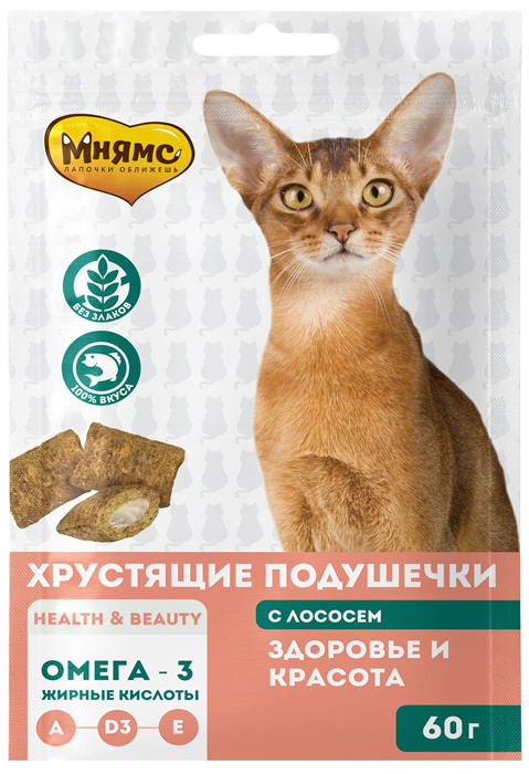 МНЯМС Здоровье и красотаХрустящие подушечки с лососем - хрустящее лакомство с начинкой для кошек. Это изысканное и полезное угощение, от которого не откажется даже самая привередливая и избалованная кошка. Входящие в состав Омега-3 жирные кислоты, витамины А, D3, Е предотвращают воспалительные процессы в организме, благотворно воздействуют на кожу и шерсть.