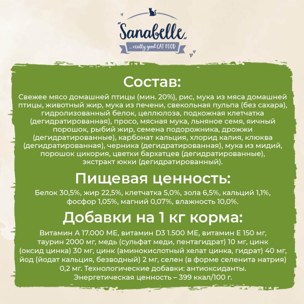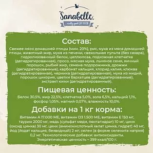 | Состав | Свежее мясо домашней птицы (мин. 20 %), рис, мука из мяса домашней птицы, животный жир, мука из печени, свекольная пульпа (без сахара), гидролизованный белок, целлюлоза, подкожная клетчатка (дегидратированная), просо, мясная мука, льняное семя, яичный порошок, рыбий жир, семена подорожника, дрожжи (дегидратированные), карбонат кальция, хлорид калия, клюква (дегидратированная), черника (дегидратированная), мука из мидий, порошок цикория, цветки бархатцев (дегидратированные), экстракт юкки (дегидратированный). |