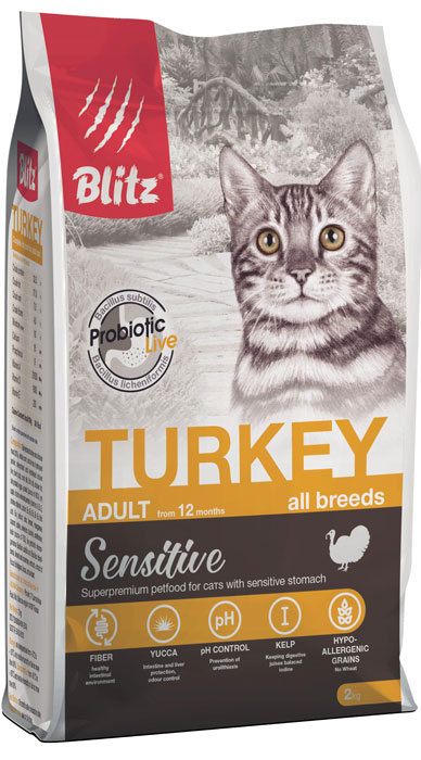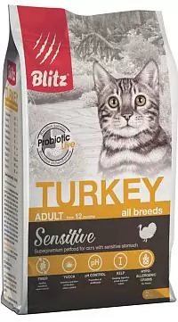 Сухой корм Blitz For Adult Cats Turkey с индейкой для взрослых кошекНовый сухой корм Blitz со сбалансированным составом насытит организм вашего питомца всеми необходимыми и ценными витаминами, микро- и макроэлементами. Этот полнорационный корм класса суперпремиум поддержит здоровье, физическую форму и внешний вид вашей кошки. Содержит только качественные отборные ингредиенты, благодаря чему максимально удовлетворит все потребности кошек. Употребление этого корма способствует укреплению иммунитета и профилактике различных заболеваний.