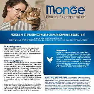 Сухой корм для кошек Monge SterilisedMonge Sterilised - это полноценный сбалансированный сухой рацион, предназначенный для питания стерилизованных кошек. Содержит важнейшие антиоксиданты, такие как витамин Е, для поддержания иммунной системы.