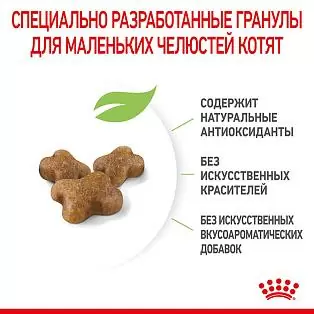 Специально разработанные гранулы продукта ROYAL CANIN® Kitten подходят для крошечных челюстей котят и облегчают процесс захватывания и разгрызания корма, а также поддерживают здоровье полости рта за счет эффекта механической очистки зубов во время их разгрызания.