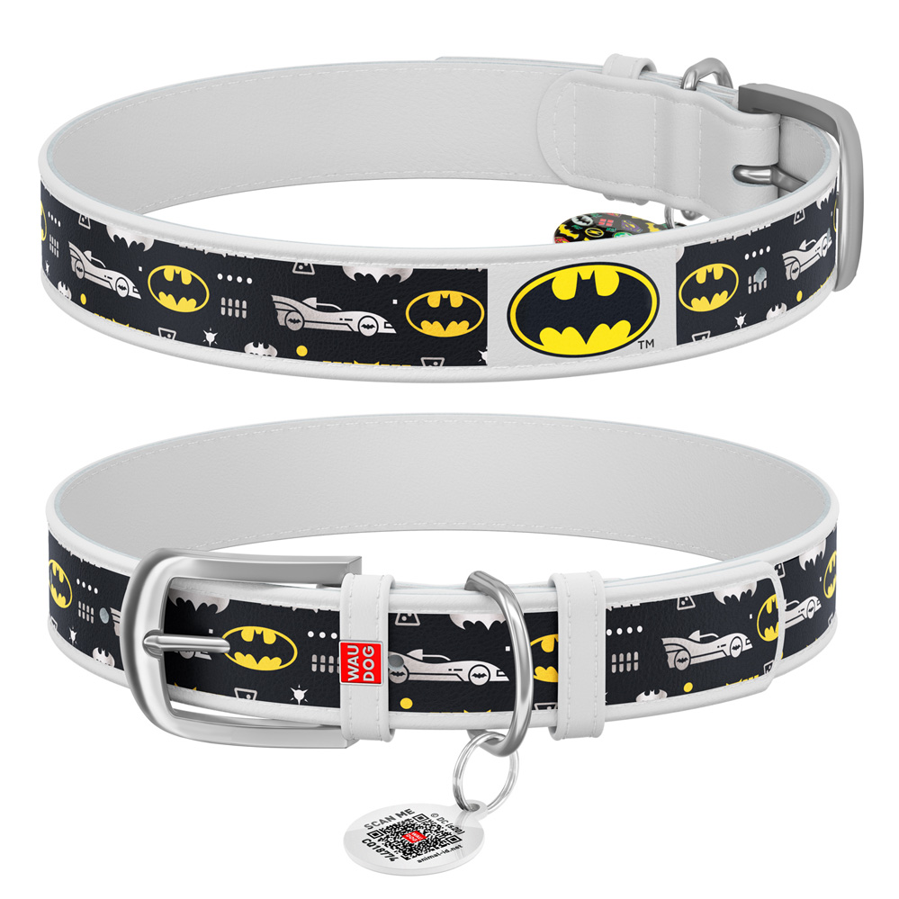 Ошейник Waudog кожаный Design с QR паспортом рисунок "Бэтмен3" размер XS кожа 19-25x1,2 см