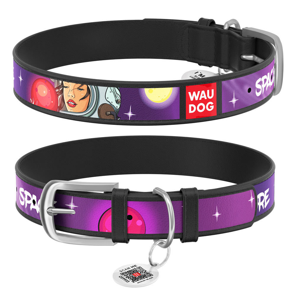 Ошейник Waudog кожаный Design с QR паспортом рисунок «Больше космоса» размер M кожа 30-39x2 см