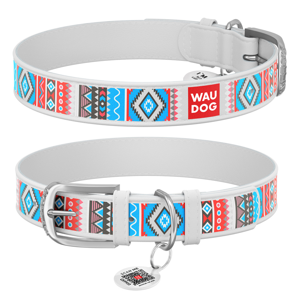 Ошейник Waudog кожаный Design с QR паспортом рисунок "Этно" размер XS кожа 21-29x1,2 см