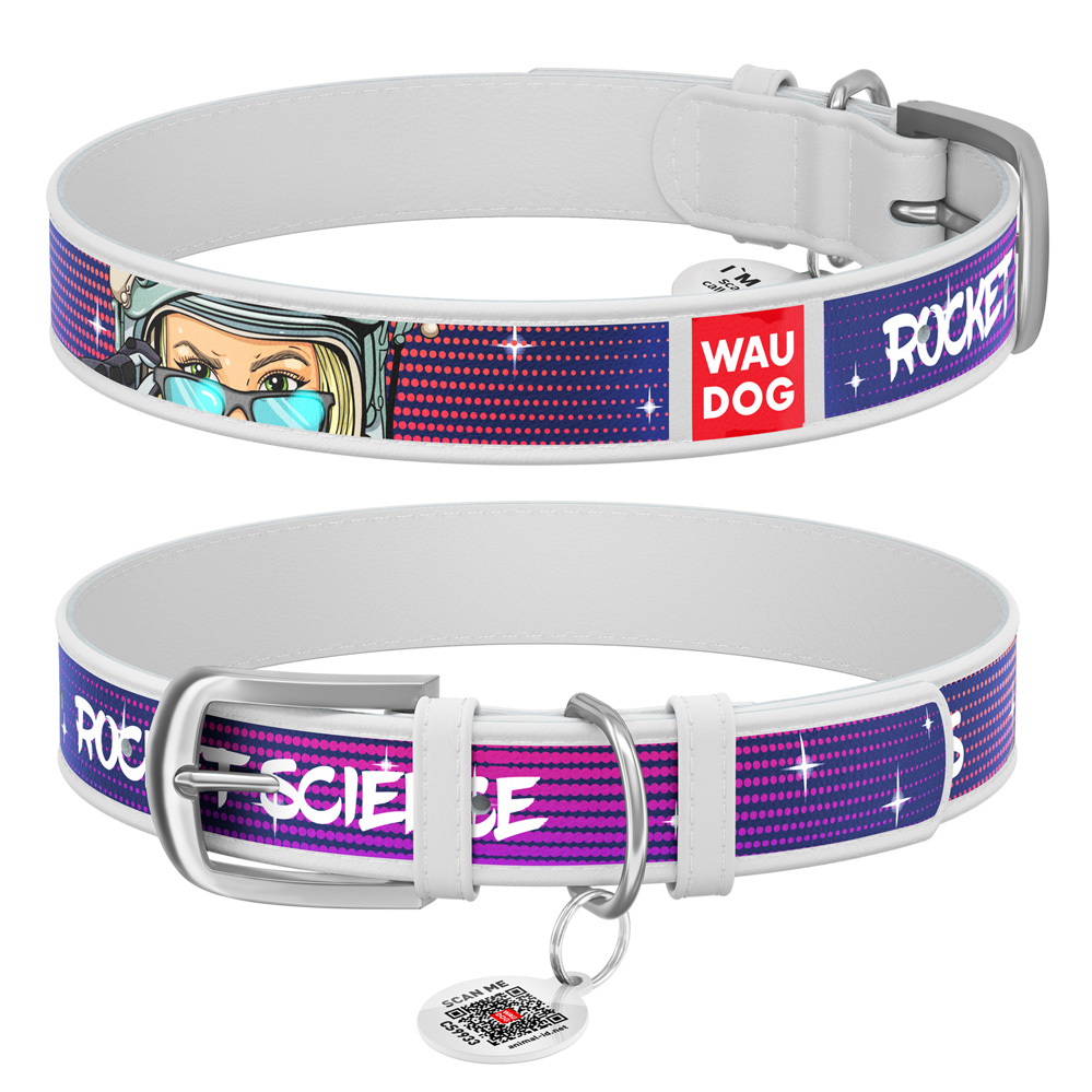 Ошейник Waudog кожаный Design с QR паспортом рисунок «Космос. Ракетостроение» размер L кожа 38-49x2,5 см