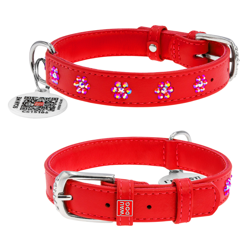 Ошейник Waudog кожаный Glamour с QR паспортом с клеевыми стразами "Цветочек" размер S кожа 30-39x2 см