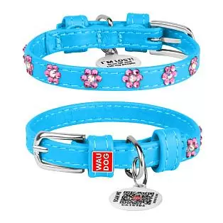 Ошейник Waudog кожаный Glamour с QR паспортом с клеевыми стразами "Цветочек" размер XS кожа 18-21x0,9 см