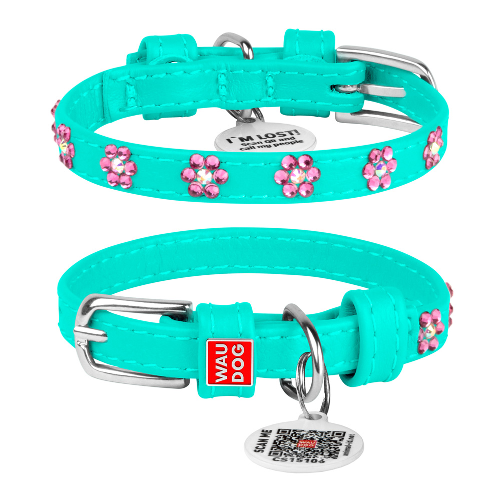 Ошейник Waudog кожаный Glamour с QR паспортом с клеевыми стразами "Цветочек" размер XS кожа 21-29x1,2 см
