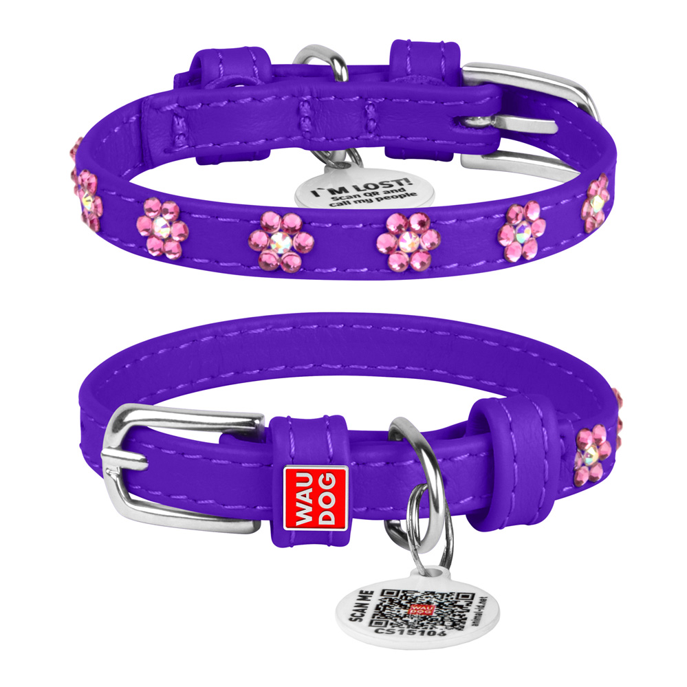 Ошейник Waudog кожаный Glamour с QR паспортом с клеевыми стразами "Цветочек" размер XS кожа 21-29x1,2 см