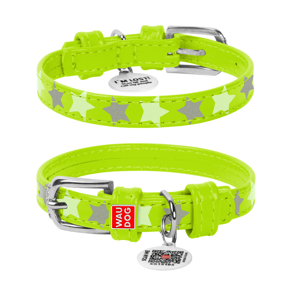Ошейник Waudog кожаный Glamour с QR паспортом узор "Звёздочка" светящийся/светоотражающий размер XS кожа 27-36x1,5 см