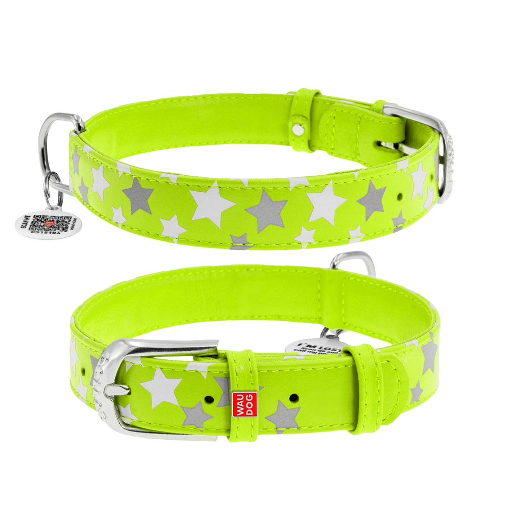 Ошейник Waudog кожаный Glamour с QR паспортом узор "Звёздочка" светящийся/светоотражающий размер S кожа 30-39x2 см
