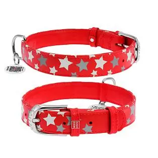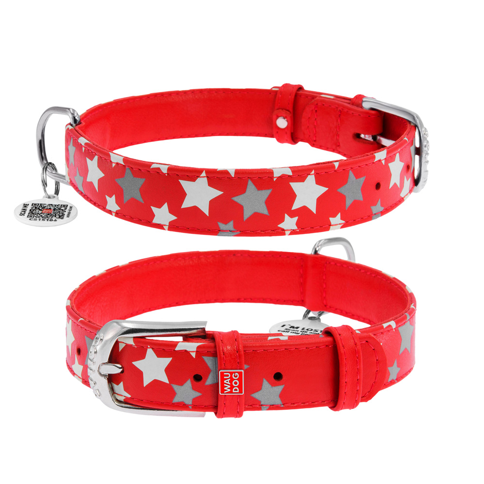 Ошейник Waudog кожаный Glamour с QR паспортом узор "Звёздочка" светящийся/светоотражающий размер M кожа 38-49x2,5 см