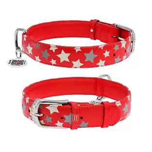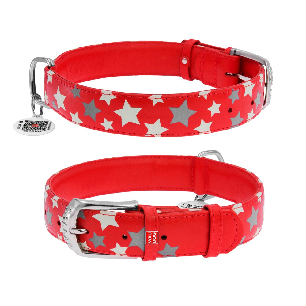 Ошейник Waudog кожаный Glamour с QR паспортом узор "Звёздочка" светящийся/светоотражающий размер L кожа 46-60x3,5 см