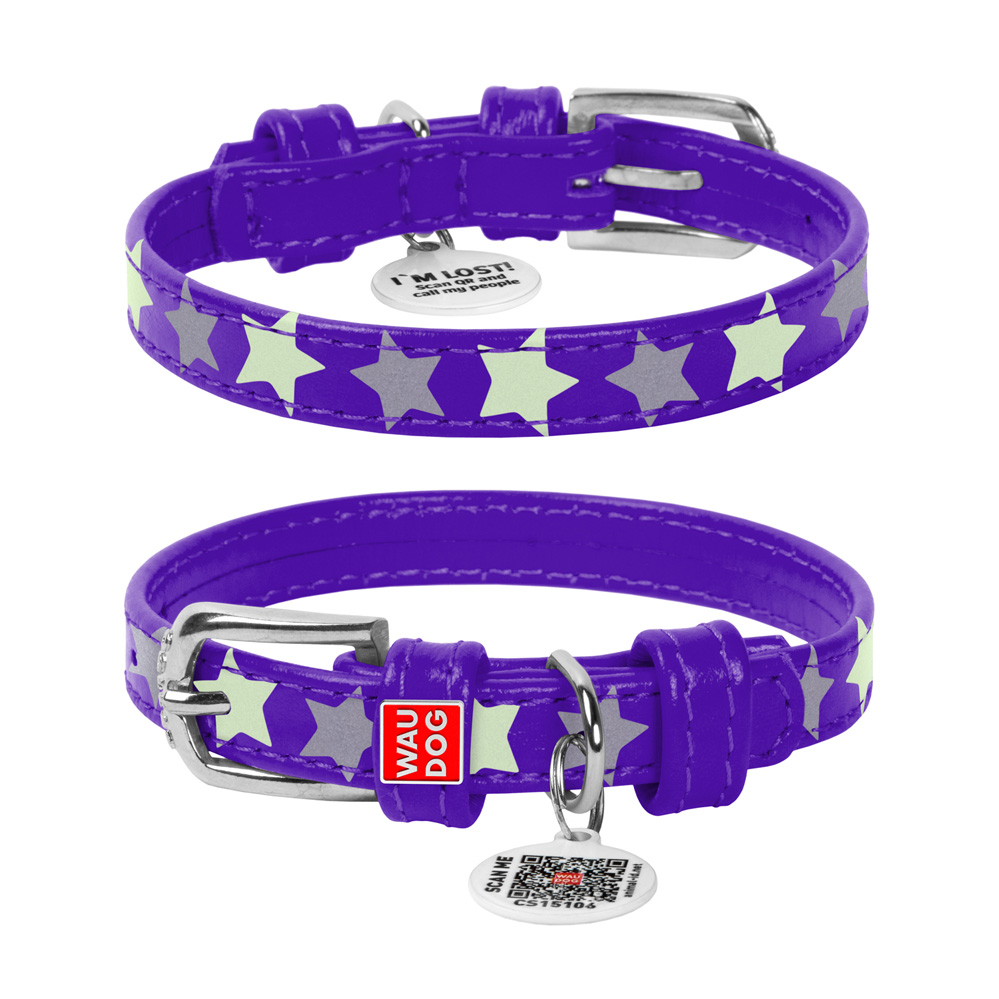 Ошейник Waudog кожаный Glamour с QR паспортом узор "Звёздочка" светящийся/светоотражающий размер XS кожа 19-25x1,2 см