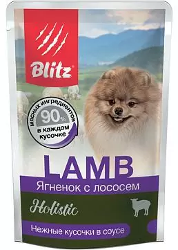 Влажный корм для собак Blitz для мелких пород с ягненком и лососем кусочки в соусе