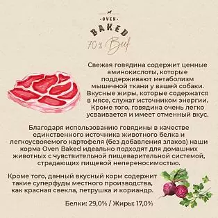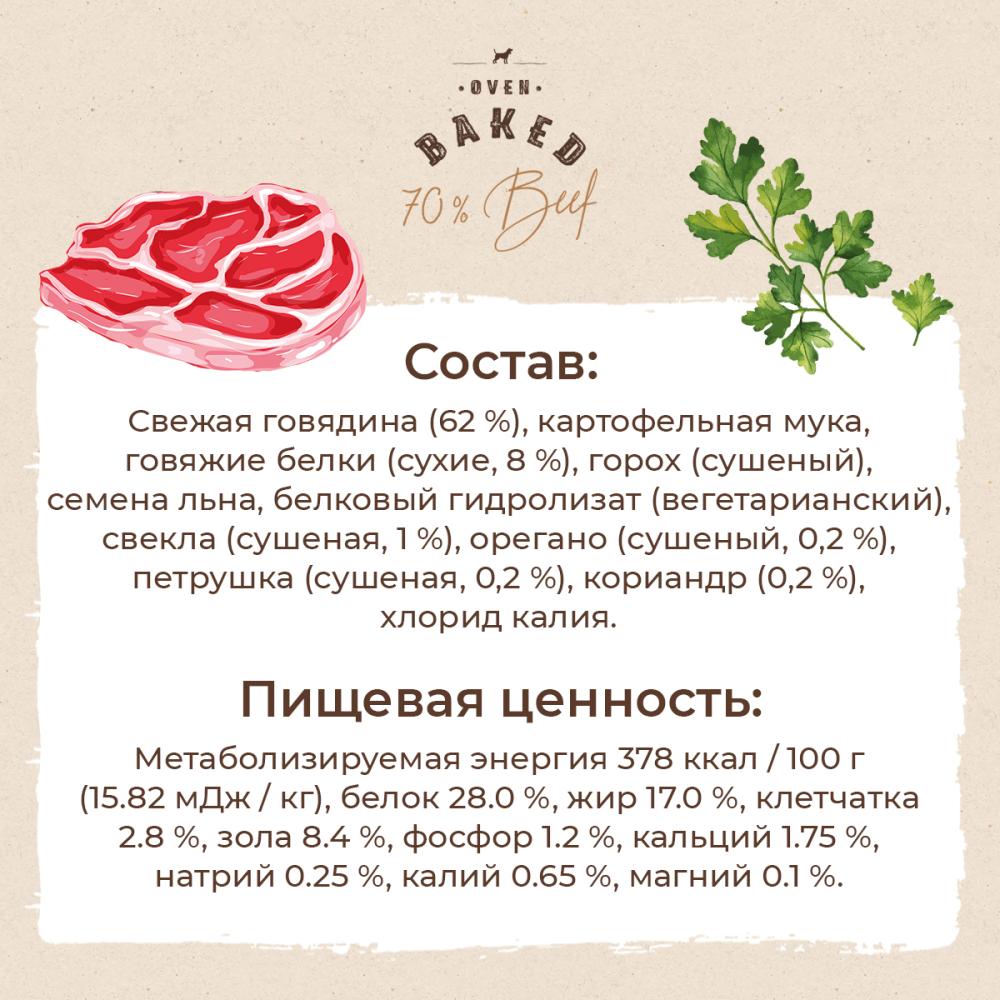| Краткое описание | Это запеченные в духовке гранулы с невероятным вкусом, от которого ваша собака придет в восторг. В ходе нашего особого процесса производства удается сохранить белки и необходимые витамины из тщательно отобранных ингредиентов. Благодаря этому корма линейки Oven Baked легко усваиваются. Хрустящие запеченные в духовке гранулы линейки Oven Baked с содержанием 70 % мяса идеально подходят как для взрослых гурманов, так и для большинства собак с чувствительной пищеварительной системой и пищевой непереносимостью. — монобелковый* — беззлаковая рецептура* — для взрослых собак с пищевой непереносимостью — особый процесс производства — изысканный вкус — повышенное содержание животного белка (70 %) — качественный полноценный корм с суперфудами местного производства |