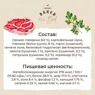 | Ингредиенты | Свежая говядина (62 %), картофельная мука, говяжие белки (сухие, 8 %), горох (сушеный), семена льна, белковый гидролизат (вегетарианский), свекла (сушеная, 1 %), орегано (сушеный, 0,2 %), петрушка (сушеная, 0,2 %), кориандр (0,2 %), хлорид калия. |