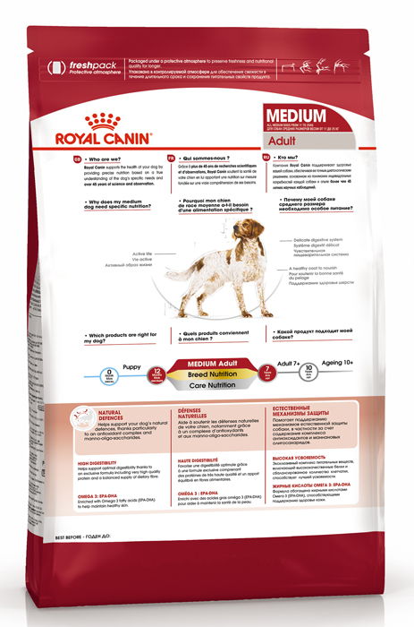 Продукт ROYAL CANIN® Medium Adult разработан специально для удовлетворения особых потребностей вашей собаки средних размеров (вес взрослой собаки от 11 до 25 кг) в возрасте от 1 до 7 лет.