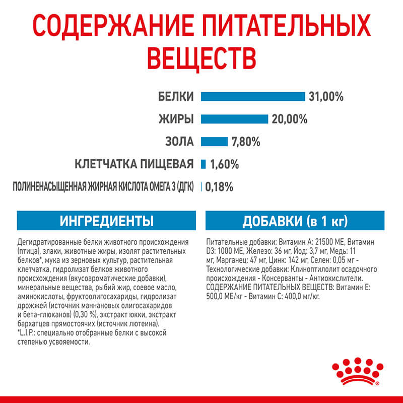 | Ингредиенты | дегидратированные белки животного происхождения (птица), рис, животные жиры, изолят растительных белков*, растительная клетчатка, пшеница, мука из зерновых культур, гидролизат белков животного происхождения (вкусоароматические добавки), минеральные вещества, рыбий жир, соевое масло, фруктоолигосахариды, гидролизат дрожжей (источник мaннановых олигосахаридов), экстракты дрожжей (источник бета-глюканов), экстракт бархатцев прямостоячих (источник лютеина). |
