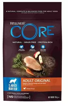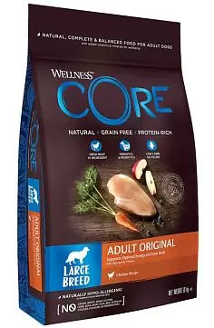 Wellness CORE —полнорационный беззерновой корм класса холистик, который создан с учётом естественных потребностей домашних любимцев, которые являются хищниками по своей природе. Именно поэтому все корма CORE беззерновые и содержат свежее мясо и рыбу на первом месте во всех рационах. Каждый рацион CORE для собак обладает привлекательным вкусом, хорошо усваивается, не содержит пшеницы, клейковины, кукурузы, сои, молочных продуктов, искусственных красителей, ароматизаторов и консервантов.CORE Large Breed Adult разработан с учётом специфических потребностей собак крупных пород. В составе есть хондропротекторы, которые поддерживают суставы в отличной форме. Высокое содержание белков и жиров обеспечивает собак энергией, а благодаря сбалансированному составу корм хорошо усваивается.