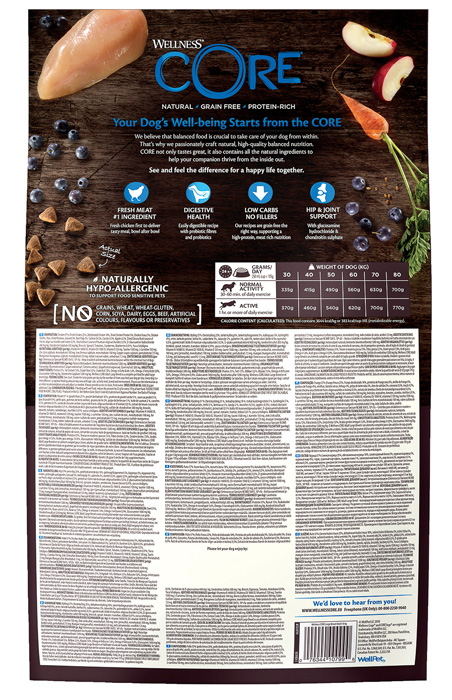 Рацион CORE Original богат животным белком, который помогает питомцу поддерживать хорошую физическую форму, а входящие в состав жиры и жирные кислоты способствуют улучшению шерстного покрова. Пробиотики и пребиотики нормализуют работу микрофлоры желудочно-кишечного тракта, улучшают моторную функцию кишечника, оптимизируют процесс пищеварения и укрепляют иммунитет.