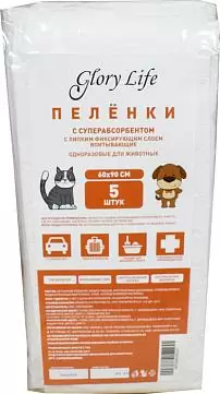 Пеленки Glory Life c суперабсорбентом и липким фиксирующим слоем одноразовые для животных белые 5 шт 60x90 см